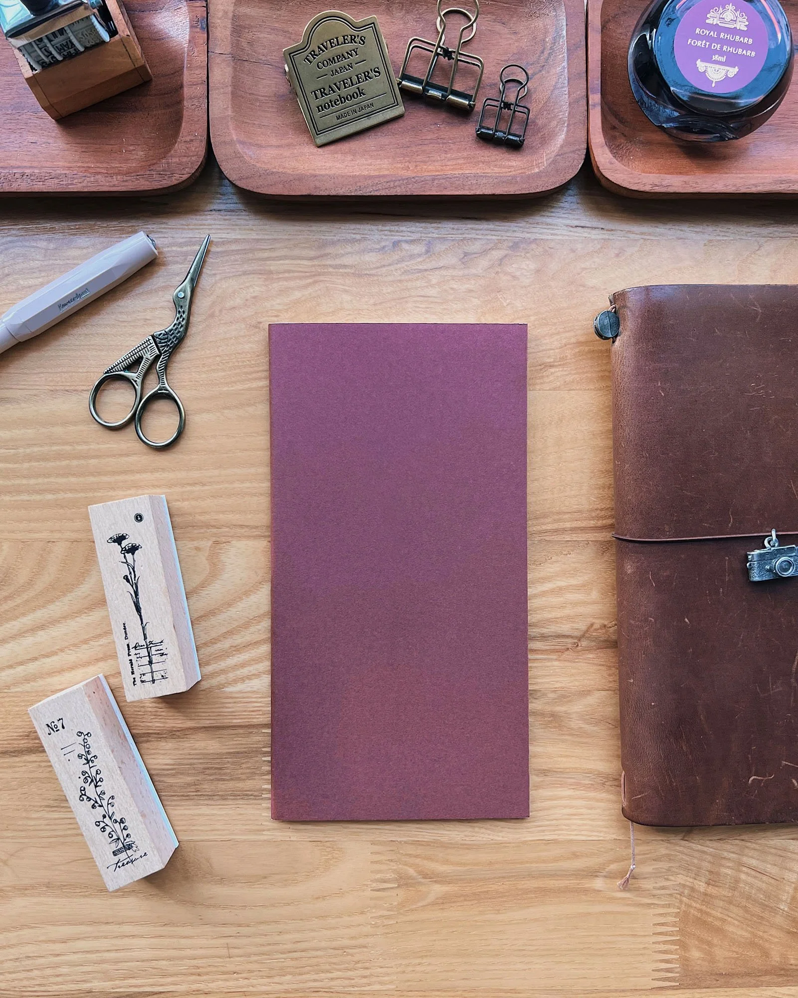 A bordeaux Tomoe River Paper notebook that fits perfectly in a standard Traveler’s Notebook cover.